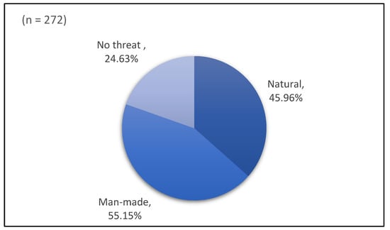 Furthermore, when asked about the type of disaster their organizations are most vulnerable to, Figure 5 shows that 45.96% of respondents believed natural disasters were the most likely threat, while 55.15% perceived human-made disasters as the more probable scenario. The category “no threat” refers to situations where employees didn’t see any significant risk of a disaster occurring. Figure 5 highlights the importance of understanding employees’ perceptions of the types of disasters that may impact their organizations to effectively plan and prepare for potential disasters.