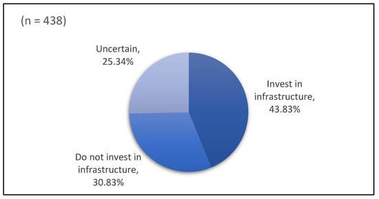 Despite receiving the highest mean score of 3.26, respondents continued to express confusion and uncertainty regarding the effectiveness of the operational and supply chain strategies employed by their organizations during the mitigation phase of the disaster management cycle. For instance, when inquiring about their organizations’ investments in infrastructure aimed at mitigating risks associated with potential disasters and crises, such as shelters, storage and backup facilities, transportation vehicles, and backup power supplies, only 191 out of the 438 survey participants (43%) confirmed their organizations’ investment in such infrastructure. Moreover, only 54 of the 191 respondents had direct experience with or received instructions regarding how to use these infrastructures during emergencies. Furthermore, 56% of the 54 respondents who had direct experience with such infrastructure believed the facilities are adequate for use in disaster situations. On the other hand, approximately 30% of the 438 respondents claimed that their institutions do not invest in infrastructures to mitigate the effects of disastrous events, while 25% were uncertain whether their institutions invest in such infrastructures. These data are shown in Figure 6.
