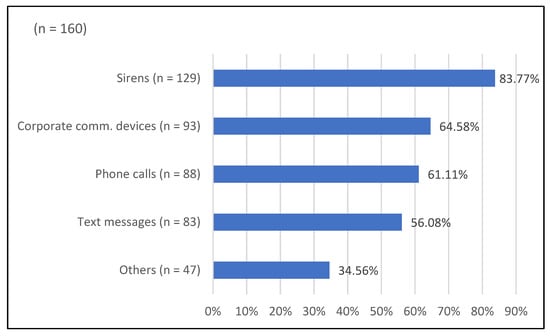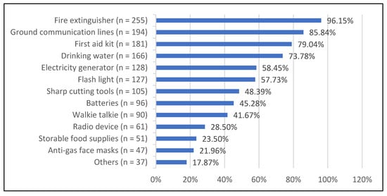Figure 8 depicts that when asked whether their organizations offer tools or emergency kits that employees can use in case of disasters and crises, about 62% responded that they did. The most frequently cited tools and emergency kits are fire extinguishers (96.15%), ground communications lines (85.84%), first aid kits (79.04%), and drinking water (73.78%). However, other tools and emergency kits were also provided, as illustrated in Figure 8. Moreover, additional tools and emergency kits, such as infirmaries, gas detectors, and firearms, were cited by almost 17% of respondents in the “others” category.