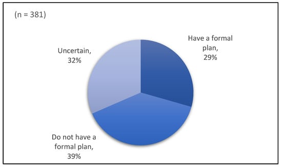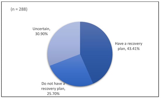 The survey’s recovery phase items revealed a mean score of 2.91, implying that respondents expressed uncertainty regarding their organizations’ ability to recover effectively and adequately from disasters. The recovery phase is characterized by coordination and collaboration among various stakeholders, including government agencies, non-governmental organizations, private sector entities, and communities, to ensure an efficient and streamlined recovery process. For instance, only 29.4% of the 288 respondents who were asked about their organizations’ recovery plans reported having a formal recovery strategy. In contrast, 25.7% of respondents confirmed that their organizations lacked a proper recovery strategy, and 30.9% were uncertain whether their organizations had one. These findings are illustrated in Figure 20. Additionally, approximately 32% of respondents indicated that their organizations had established laws, resolutions, or procedures to support employees affected by disasters or crises in recovering from or overcoming their challenges. In contrast, approximately 35% of respondents denied the existence of such procedures, and about 32% were unsure whether such procedures existed in their organizations.