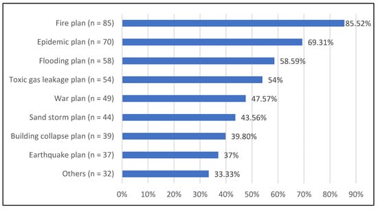 Figure 10 reveals that the fire plan was the most cited preparedness plan with a score of 85.52%, followed by the epidemic plan (69.31%) and the flooding plan (58.59%). Additionally, other plans were also mentioned. Moreover, plans such as the “art of dealing with people with neurological diseases,” “armed robbery plan,” “operational failure of computer systems,” and “hacking of consumer accounts and information” were also cited by almost 33% of respondents in the “others” category. Furthermore, over 62% of respondents who indicated the presence of preparedness plans in their organizations also reported that their organizations had established guidelines to assist individuals with special needs and disabilities.