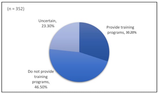 Nonetheless, merely possessing a plan may not be sufficient if it is not accompanied by practice or training. Out of the 352 respondents who addressed the question regarding their organizations’ preparedness training programs, encompassing emergency protocols and procedures, only 30.11% confirmed that their organizations offer disaster preparedness training programs in relation to their plans. Meanwhile, 46.59% indicated that their organizations do not provide any training programs, and 23.3% were uncertain whether their organizations had any formal preparedness training programs. These data are depicted in Figure 11. Nonetheless, among the respondents who reported that their organizations offer training programs, a majority of 62.75% confirmed their active participation in such programs.