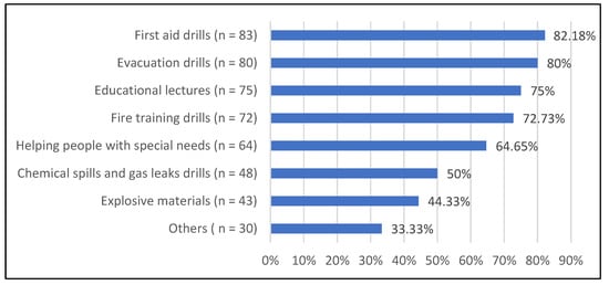 The data also reveal that 80% of the organizations providing training programs are government institutions, while 17.5% are private sector organizations, and a mere 2.5% are non-profit organizations. Figure 12 reveals that first aid drills were the most cited training program with a score of 82.18%, followed by evacuation drills (80%), educational lectures (75%), and fire training drills (72.73%). Additionally, other training programs were also mentioned. Moreover, almost 33% of respondents in the “others” category also cited exercises such as “war drills” and “armed robbery drills.”
