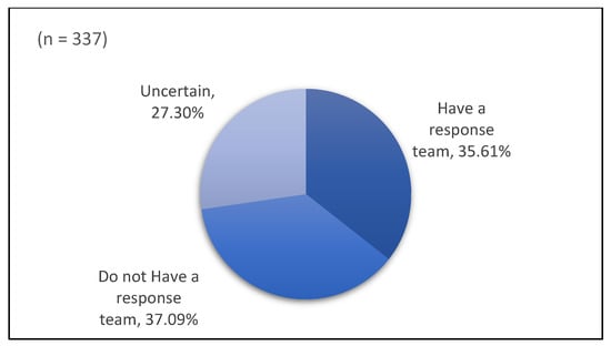 A mean score of 3.08 for the response phase items indicates that respondents were uncertain whether or not their organizations could adequately respond to disastrous events. Only 35.61% of the 337 individuals who answered the question on the presence of a disaster management response team in their organizations confirmed the presence of such a team, 37.09% denied its existence, and 27.3% were uncertain. These data are depicted in Figure 13. The majority of respondents (44%) who confirmed the presence of a disaster management response team in their organizations believed that the team has complete operational authority, signifying decentralized decision-making. In contrast, 25% believed the team lacks such operational autonomy, and more than 30% were uncertain of the team’s operational authority.