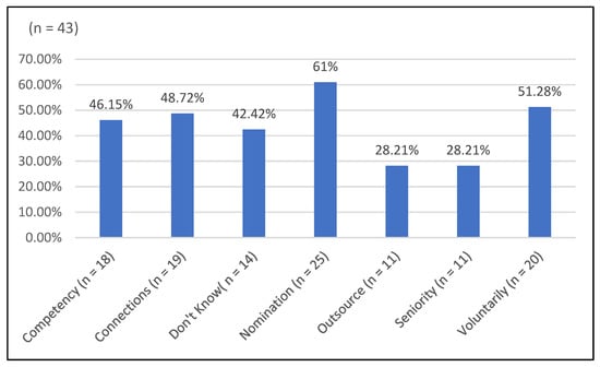 Figure 15 provides a breakdown of the various methods organizations utilize to establish disaster management response teams, as reported by respondents who expressed confidence in forming such teams in response to catastrophic events. It is essential to note that the data presented are entirely based on the perspectives of these individuals. In addition, it is worth noting that the categories presented in Figure 15 are not mutually exclusive. As a result, some respondents reported utilizing multiple approaches to select disaster management response teams within their organizations. Consequently, some respondents may have chosen multiple methods for determining disaster management response teams. Based on the data presented in Figure 15, it can be inferred that a significant proportion of respondents (61%) believed that disaster management teams are selected through “nomination” methods. This approach entails the recommendation or suggestion of another individual or a group of individuals, based on factors such as trust, expertise, or seniority, rather than through an open application or selection process. In addition, 51.28% of the respondents believed such teams are formed based on individuals volunteering for such positions. On the other hand, the data presented in Figure 15 indicate that a significant proportion of respondents (48.72%) believed that disaster management response teams are formed based on personal “connections,” regardless of individuals’ qualifications and competencies. In comparison, 46.15% believed that such teams are formed based on individual competencies. Therefore, based on the data presented in Figure 15, a significant proportion of respondents believed that personal “connections” play a huge role in forming disaster management response teams. Finally, it is worth noting that a smaller proportion of respondents believed that disaster management response teams are formed based on seniority or outsourcing, with 28.21% of respondents believing each of these methods to be used equally.