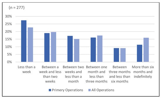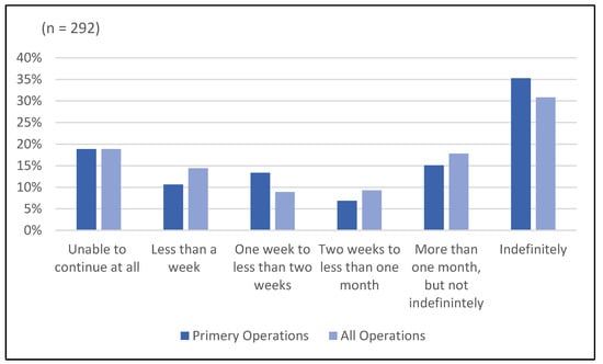 When survey participants were asked whether or not their organization could continue operations and for how long, the vast majority believed that in the event of a disaster, their organizations could continue both primary and other supporting operations indefinitely. However, a significant proportion of respondents (18.84%) reported that their organizations would be unable to continue either primary or any other operations in the event of a disaster. This finding highlights the need to improve disaster preparedness and resilience in such organizations. These data are depicted in Figure 18.