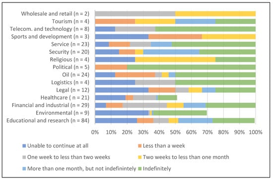 Figure 19 presents a breakdown of the respondents’ perceptions of their organizations’ ability to maintain primary operations during a disaster, categorized by sector type. The results highlight a significant gap in employees’ understanding of their organizations’ disaster resilience across several sectors. For example, around 26% of respondents in the educational and research sector expressed confidence that their institutions could continue primary operations indefinitely during a disaster. However, the same percentage within the same sector lacked confidence in their organizations’ ability to sustain primary operations, indicating that their institutions may not be able to continue primary operations at all. These findings suggest a discrepancy in perceptions of organizational preparedness within the educational and research sector.