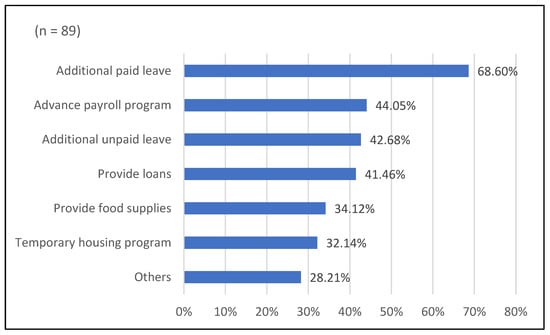Figure 21 illustrates the various support programs organizations offer to their employees in the event of a disaster, with additional paid leave being the most commonly reported form of aid (68.6%). Additionally, 28.21% of respondents mentioned other forms of support under the “others” category, such as health insurance programs.