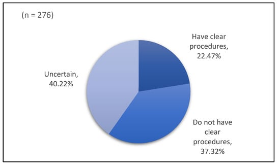 Finally, when queried about the existence of clear and expedient procedures for the reconstruction of buildings and infrastructure damaged by disasters and crises, including the timely provision of necessary equipment, materials, and personnel to affected areas, only 22.47% of respondents indicated that their organizations possessed clear procedures, while 37.32% expressed doubts, and 40.22% were uncertain. These results are shown in Figure 23.