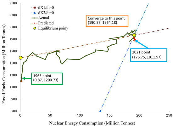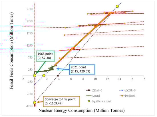 This study further explored the equilibrium stability of pair one, nuclear and fossil fuels in the United States since we found obvious correlations between the two energy types. This work utilized the eigenvalues of the Jacobian matrix to examine equilibrium stability. This work computed the negative real parts of the Jacobian matrix of the Lotka–Volterra equations for the pairs of nuclear and fossil fuel consumption in the United States. This work additionally used Lyapunov functions to examine equilibrium stability. This work computed the positive Lyapunov functions and the negative first differentials of the Lyapunov functions to prove the equilibrium stability. Figure 1 depicts the consumption trajectories of fossil fuels and nuclear energy in the United States. The trajectories were found to start in 1965 and rise with simultaneous increases in nuclear energy and fossil fuel consumption. The intersecting point of the two straight lines, which are two linear functions (a1 − b1X1 − c1X2 = 0, and a2 − b2X2 − c2X1 = 0), is the equilibrium point. Fossil fuel and nuclear energy consumption reached 1811.57 and 176.75 million tons of oil equivalent in 2021, respectively, and were not over the saturation boundaries. As our proposed Lotka–Volterra equations were shown to satisfy the stable conditions proposed by Hritonenko and Yatsenko [45], the annual consumption of fossil fuels and nuclear energy approached 1964.18 and 190.57 million tons of oil equivalent, respectively.
