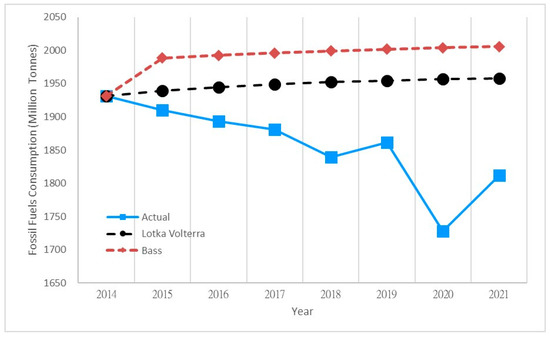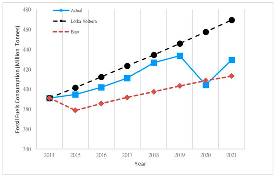 This section presents the forecast accuracy analysis results for the test period. Figure 3 and Figure 4 depict the United States’ and Africa’s fossil fuel consumption trajectories for pair one, respectively. Figure 3 and Figure 4 show that the values predicted using the proposed Lotka–Volterra model were closer to the actual values in comparison with the values predicted with the Bass model in the United States and Africa, respectively. This suggests that our proposed Lotka–Volterra model outperforms the traditional Bass model in forecasting the trajectories of fossil fuel consumption because our proposed Lotka–Volterra model takes the interactions between different energy types into account.