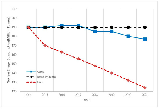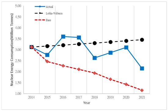 Figure 5 and Figure 6 depict the United States’ and Africa’s nuclear consumption trajectories for pair one, respectively. Figure 5 and Figure 6 show that the values predicted using the proposed Lotka–Volterra model were closer to the actual values in comparison with the values predicted with the Bass model in the United States and Africa, respectively. This suggests that our proposed Lotka–Volterra model outperforms the traditional Bass model in forecasting nuclear energy consumption trajectories because our proposed Lotka–Volterra model takes the interactions between different energy types into account.