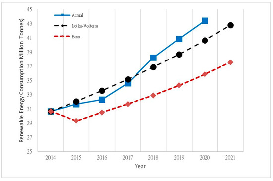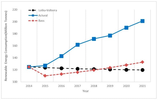 Figure 7 and Figure 8 depict the United States’ and Africa’s renewable consumption trajectories for pair two, respectively. Figure 7 and Figure 8 show that the values predicted using the proposed Lotka–Volterra model were closer to the actual values in comparison with the values predicted with the Bass model in the United States and Africa, respectively. This suggests that our proposed Lotka–Volterra model outperforms the traditional Bass model in forecasting renewable energy consumption trajectories because our proposed Lotka–Volterra model takes the interactions between different energy types into account.
