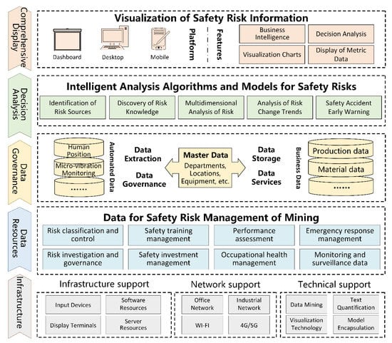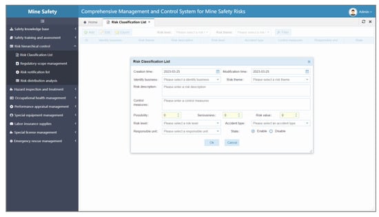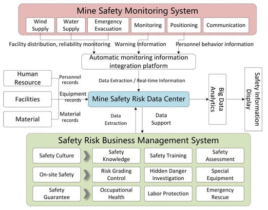 The development of modern information technology has created conditions for the transformation of mining safety risk management methods. Many mines have established corresponding control systems according to their own safety management needs. In terms of the construction of a safety monitoring system, Zhang [] built a mining safety monitoring system based on GIS technology, which realized the full-process monitoring and supervision of mining safety production. Wang [] and Chen [] built sensor-based mining safety remote monitoring systems, which proposed a new solution for mine safety risk management. Wu et al. [] constructed a mobile intelligent mining early warning platform using technologies such as the Internet of Things, mobile Internet, and intelligent control theory, which effectively solved the bottleneck problem of mine information management and safety early warning. For the aspect of safety management business system construction, some scholars have also conducted research, mainly focusing on safety training management [], occupational health management [], and emergency rescue management [].