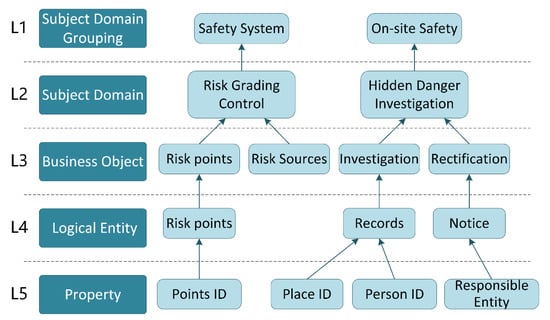 After data governance, safety risk data form a five-layer hierarchical structure of subject domain grouping, subject domain, business object, logical entity, and attributes. Taking security risk management data as an example, the hierarchical structure after governance is shown in Figure 4.