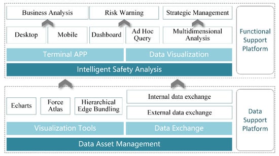 By constructing safety risk big data analysis models and algorithms, researching and investigating new approaches to the scientific management of mine safety risks, and fully exploring the potential value of mine safety production data, the overall implementation process of safety risk intelligence analysis and early warning is performed, as shown in Figure 5. Based on the standardized safety business data and monitoring data, the existing big data analysis models and algorithms were modularized, encapsulated, and materialized to rapidly respond to data analysis requirements. Finally, the integrated display of risk information was achieved through business intelligence tools and data visualization algorithms.
