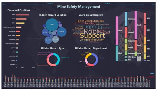 The visualization system was built through business intelligence analysis tools. By connecting with the data center, massive amounts of data can be extracted and combined. Finally, through the application of visualization technology, various analysis charts, and models formed by the physical application of safety risk big data analysis were integrated and displayed. The system supports data penetration and linkage functions for key data and dynamically monitors the status of mine safety operations. The integrated visualization architecture of the safety risk information is shown in Figure 6.