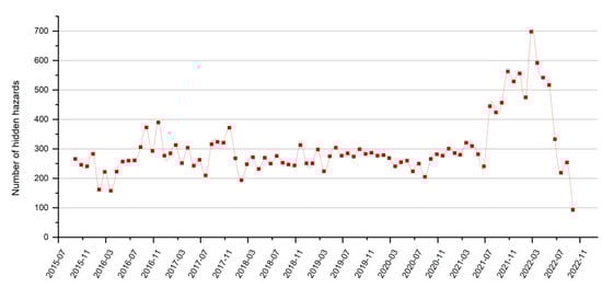 Aiming at the highly concerned issue of intelligent analysis and decision-making of mining safety risks, with the goal of integration, systematization, and intelligence, an intelligent analysis and decision-making system of safety risks has been developed using big data analysis and business intelligence technology. The construction and application of the system have greatly strengthened the safety management level of the mine, making the production process of the mine smoother and more orderly, avoiding the instability of production processes caused by the evolution and expansion of safety risks, and effectively improving production efficiency. Big data analysis makes all aspects of safety management clear and transparent, enabling the timely detection, tracing, and handling of various risks, effectively eliminating hidden hazards of accidents and reducing the occurrence of casualties. The trend in the frequency of hidden hazards in the service of mine safety hazard investigation is shown in Figure 10.