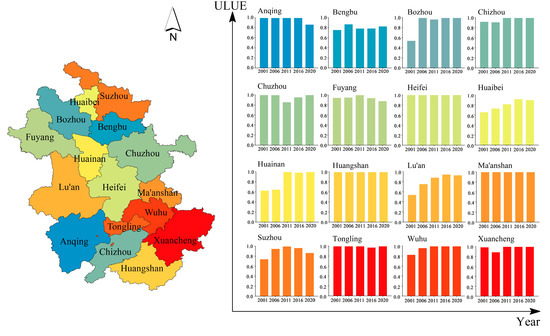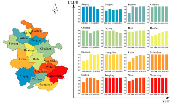 - From the results of urban land use efficiency, the overall level of ULUE in Anhui Province is high, but the gap between the different cities remains large. Compared to the results of the third stage, the ULUE values of most cities in the first stage changed significantly. To ensure the accuracy of the results, it is necessary to ensure that each city has the same external environment and luck conditions.