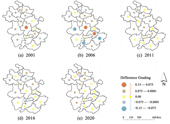 The ULUE difference map of the first and third stages in Anhui Province from 2001 to 2020. (a) The ULUE difference in 2001; (b) the ULUE difference in 2006; (c) the ULUE difference in 2011; (d) the ULUE difference in 2016; (e) the ULUE difference in 2020.