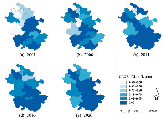 The time series change map of ULUE value in Anhui Province from 2001 to 2020. (a) The ULUE value in 2001; (b) the ULUE value in 2006; (c) the ULUE value in 2011; (d) the ULUE value in 2016; (e) the ULUE value in 2020.