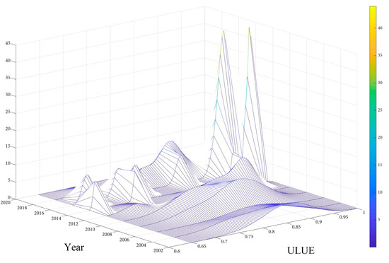 The kernel density estimation map of ULUE value in Anhui Province from 2001 to 2020.