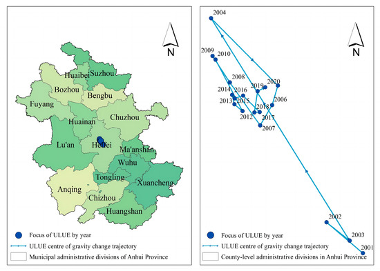 - From the perspective of spatial and temporal evolution, the center of gravity of the ULUE space moves slowly, and the moving distance remains small. The migration rate and distance of the efficiency center of gravity in the north–south direction are far greater than those in the east–west direction, which is related to the current situation and economic development of Anhui Province.