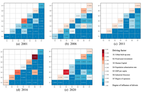 If the maximum value of the factor contribution rate in each year is taken as the main driving factor of the clues, the main driving factor in 2001, 2006, 2016, and 2020 is the urban built-up area (X1), and the main driving factor in 2016 is the degree of openness (X7). If the main driving factors of the clues are determined by the average value of the contribution during the study period, the urban built-up area (X1) is 0.8094 as the main driving factor, and the degrees of openness (X7) and development (X5) are 0.6616 and 0.6615, ranking 2, 3, the results are shown in Table 6.
