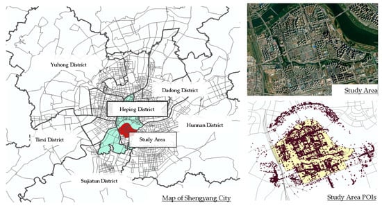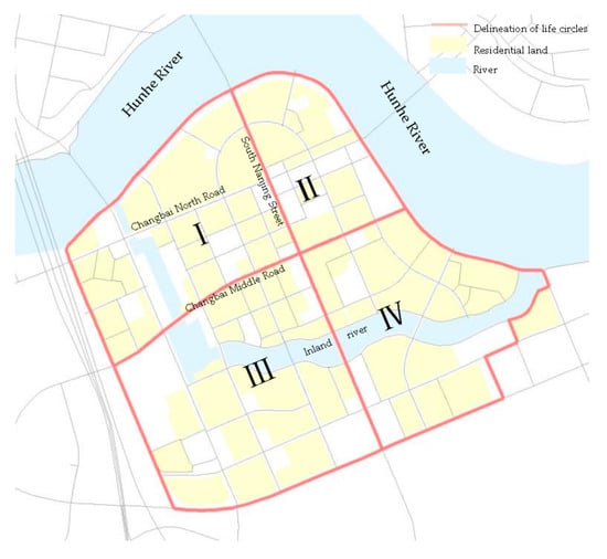 The study area is Changbai Island, Heping District, Shenyang City (Figure 1), covering an area of 87.8 km2. It is multi-functional and mostly provides residential facilities apart from ecological, leisure, and recreational functions and is important for the planned southward expansion of Shenyang in the next few years. According to the planning of Shenyang’s life circles, Changbai Island is currently divided into four life circles (Figure 2). Built completely in 2008, it is adjacent to the Hunhe River on the east and north, a railroad on the west, and the Hunnan West Road (an urban ring road) on the south, forming a relatively independent urban area. Surrounded by a water system, it has a 10-km inland river and a pleasant ecological environment. Due to its superior educational resources, the residential population has increased sharply, and the intensity of land development continues to increase, resulting in a mismatch between public amenities and population. Hence, the study area is representative of Shenyang, which has a significant variation in its quality of life.