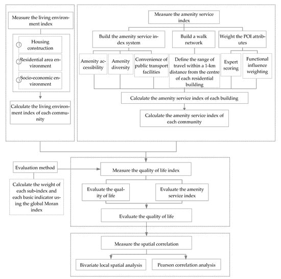 Using the communities with a walking distance of 1 km as basic research units, this study comprehensively evaluated the quality of life in communities. Figure 3 shows the technical roadmap.