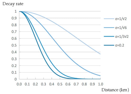 Figure 4 shows the distance decay weight of amenities. To ensure the discriminability of decay values within the distance of 0.5 to 1 km, = 1/√6 was used as the resistance coefficient of the distance decay function. The weight of each type of public amenity was determined using expert scoring and influence weighting methods (Table 1).