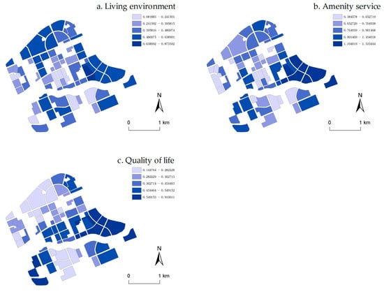 Figure 5. Living environment index (a), amenity service index (b), quality of life index (c).