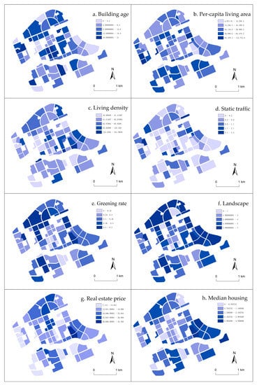 Using related studies [17,32,34,35,36,37,38] for reference, we created an index system comprising sub-themes such as housing construction, residential area environment, and real estate value and further derived eight basic indicators such as building age, per-capita living area, living density, static traffic condition, greening rate, and median housing price. Table 3 lists the calculation and description for each indicator.
