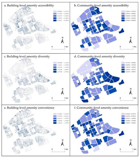 Amenity accessibility, diversity, and convenience were calculated on a building scale. Their calculation results were aggregated on a community scale to determine the average values of each community.