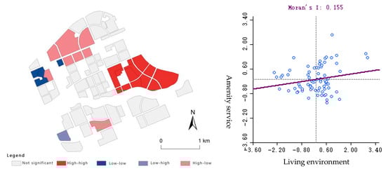 Bivariate local Moran index and scatter diagram for living environment and amenity services.