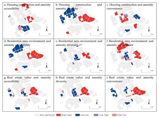 To maintain a supply–demand imbalance in public amenities, it is more advisable to adjust the supply of public amenities. Hence, local spatial autocorrelation was continuously conducted using the sub-indices of the living environment index and amenity service index.