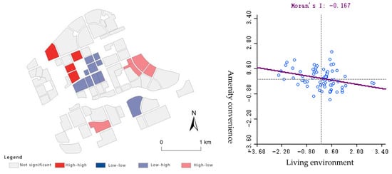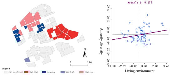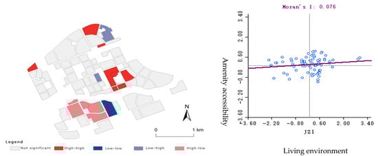 Bivariate local Moran index and scatter diagram for calculating the living environment and amenity accessibility.