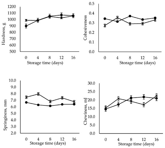Texture profile analysis (TPA) is an instrumental double compression test to measure the textural properties of food [35]. Texture properties are the main quality attributes that assess the acceptability of RTE shrimp. TPA was carried out to determine hardness, cohesiveness, springiness and chewiness indicating firmness, elasticity, stickiness and tenderness of the RTE shrimp meats, respectively [21]. Based on the TPA shown in Figure 1, the hardness and chewiness of the control sample increased significantly (p < 0.05) with storage time (16 days), whereas no significant changes occurred in the case of the GlcNAc2-coated sample. In addition, the cohesiveness and springiness in all samples were maintained throughout the storage period lasting 16 days. The results obtained here are comparable with those of an earlier publication, which reported that RTE shrimp meat, thermally processed at 85 °C for 30 min, became firmer and tender over 10 days of storage [21]. The shrimp meat exposed to heat treatment above 70 °C underwent hardening caused by protein denaturation and the shrinkage of collagen [36,37]. The thermal shrinkage experienced in the early storage period, i.e., in the first 10 days, resulted in the tightening and stiffening of the meat structure [21].