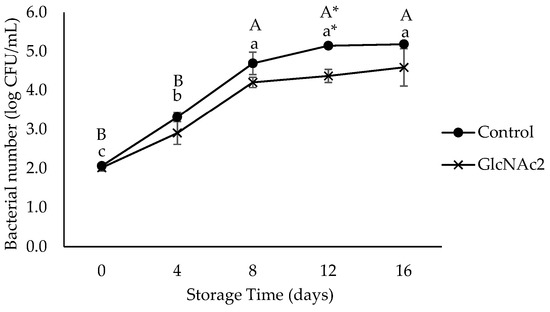 In this study, aerobic bacteria did not grow on the samples during storage (data not shown). L. monocytogenes counts on the inoculated shrimp were initially 2 log CFU/mL. The growth showed no significant differences between samples until day 8 of storage. However, a significantly lower growth (p < 0.05) of L. monocytogenes in GlcNAc2-coated samples was detected on day 12, with the highest log reduction of 0.5 log CFU/mL being observed, as shown in Figure 4. On day 16, the growth on the GlcNAc2-coated sample approached similar colony counts to those of the control.