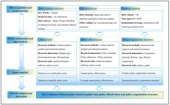 Among these items, the focus of policy content analysis includes policy subjects, objects, and tool contexts, and the common methods include content and comparative research analysis, as well as model construction and case studies. This work focuses on the content of the policy subjects, organizational structure, and tools. The research methods mainly include content and social network analysis, in addition to policy effectiveness quantification. In terms of policy effectiveness, a three-dimensional quantitative model of policy effectiveness that includes policy intensity, objectives, and measures is established based on the above-mentioned results to quantitatively analyse the content, strength, and influence of each policy text. Therefore, this paper unifies the three dimensions of policy content and effectiveness analysis, as well as policy organizational structure, into a framework of fintech policy evolution analysis to systematically understand the mechanisms and evolutionary trends of the fintech policy system [27]. The framework covers four parts, including data acquisition and preprocessing, model construction and data analysis, depth analysis, and results analysis and discussion, as shown in Figure 1.