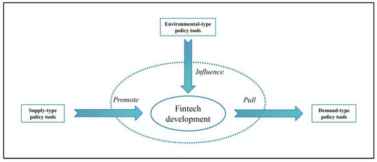 The policy object will be regulated and changed by regulatory or incentive measures from the policy subject [44], and the adjustment measure is the policy tool. Policy tools can be defined as both an ‘object’ and an ‘activity’ [27,45,46]. The existing research on the classification of policy tools is mostly derived from the ideas of Roy Roswell and Walter Ziegfeld [47]. Based on the dimensional differences in the impact of policies on technology, they divided technological innovation policy instruments into the supply, environment, and demand types. The simplified path of the three policy tools for the construction of fintech is shown in Figure 2 [27,48]. Among the tools, the role of supply-oriented ones is mainly reflected in the driving force of policies on the development of fintech, that is, directly expanding the supply through the support of scientific and technological information, infrastructure construction, capital, and personnel investment to construct and promote the advancement pace of fintech [48,49]. The main function of environmental policy tools is to improve the impact of the external environment on the construction of fintech. Specifically, the government influences environmental factors by formulating policies in areas such as goal planning, finance, taxation, and finance to provide a favourable policy environment for the development of fintech, eliminate market barriers, and indirectly affect and promote the construction pace of fintech [50,51]. The driving force of demand-oriented policy tools is mainly reflected in the pulling force of policies on fintech, which means that the government, through procurement, state-owned enterprises, and other agencies, can promote the development of international exchanges and cooperation of fintech, as well as encourage demonstration measures to create market demand and reduce market uncertainty to promote the progress of fintech [52].