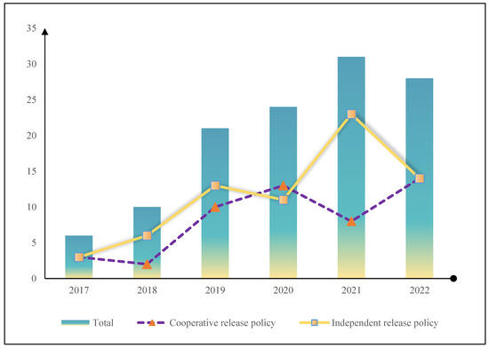 The form of policy release can be divided between the individual and joint types according to the cooperation between the issuers. The number of joint releases from multiple departments can, to a certain extent, characterise the degree of importance the government attaches to the development of fintech and its important position in socio-economic activities. Among the 120 collected fintech policy texts, the number of individually issued policies was 70 (58.33%), and the total of jointly issued policies was 50. The difference between the two forms of publication is relatively dramatic, showing that individual issuance is dominant and joint issuance is supplementary. With the continuous development of fintech, due to its informational characteristics and financial attributes, the process of policy formulation and implementation requires not only the macro-guidance and strong promotion of the National Development and Reform Commission, but also the cooperation of the Ministry of Industry and Information Technology, the Ministry of Finance, and other specific departments. Over time, fintech-related policies issued jointly gradually increased, and the numbers of both types were consistent in 2022. As can be seen from Figure 4, according to the time series distribution chart of the form of policy issuance, the proportion of policies jointly issued by various agencies rose each year and exceeded that of individual issuance in 2020. The reason for this is that, on the one hand, as the construction of fintech continues to progress, a scientific, rational, and comprehensive construction plan is more important, and a single functional government department is unable to carry out panoramic policy planning and design. On the other hand, a construction programme involving multiple fields urgently needs close and effective cooperation among multiple government departments to better form policy synergy.