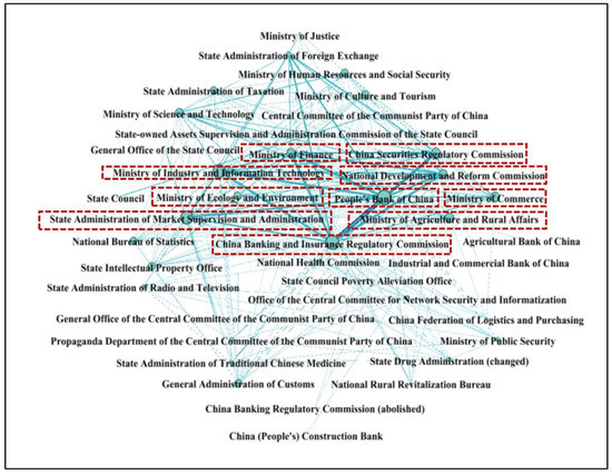 As the release of policies often involves system reform, finance and taxation, human resources, and other content modules, agencies often have difficulty formulating a scientific, reasonable, and effective policy when relying only on the power of an administrative department or a certain institution [45]. Therefore, an analysis of the real interactive and synergistic effect of the issuing agencies can more clearly determine the cooperative relationships and organisational structures behind a policy text, which is helpful in forming the resultant force of the policy and better exploiting the established effect. This study uses the Gephi 9.1 software to visually examine the organisational structure of the relevant policy issuers to analyse the cooperative relationships between and characteristics of various government agencies.