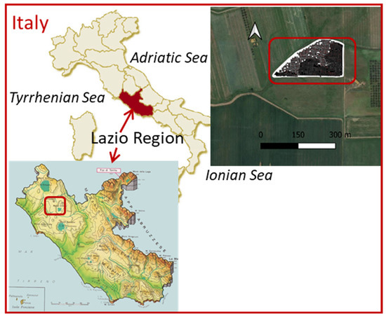 The study was carried out on a 2.96 ha surface subjected to uniform management involving rainfed cropping. The surface was part of a 7.3 ha hazelnut grove located near Viterbo in the Lazio Region, Italy (42.377034° N, 12.018766° E, 192 m asl) (Figure 1). The grove was five years old with a 5 × 5 m plantation pattern, using the Giffoni cultivar for 90% of the plants intermixed with Tonda Gentile Romana and Nocchione cultivars as pollinators, constituting the residual 10% of plants. In the soil map of the Lazio Region, the soil can be classified as Cambic Endoleptic Phaeozem or Cambic Phaeozem (World Reference Base for Soil Resources). In both cases, this represents a soil type that limits agricultural activity, especially in terms of crop choice.