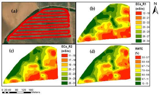 (a) Proximal ECa survey map; (b) kriged map of ECa values at 0–0.25 m depth; (c) kriged map of ECa values at 0–0.4 m depth; (d) relative water total content (RWTC).