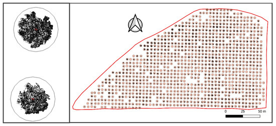 The tonalised regions were then assumed to represent the plant canopy projection areas of hazelnut trees [24]. A point vector layer with a grid corresponding to the planting layout was overlapped on the raster layer, so that each point corresponded to a tree position centroid. The centroid positions of trees placed in an irregular pattern were corrected by manually forcing each point of the grid to correspond to the actual position of each tree. A buffer layer with a 1.5 m radius was then created around each centroid so that each circle circumscribed the canopy of each tree. Thus, a multi-polygon vector layer was obtained, the centroids of which represented tree positions and the pixels inside the polygons defined the tree canopy cover. Finally, each tree in the plot was identified as an individual object, while the pixels outside were identified as the background. The number of pixels that fell within each buffer estimated the tree size.