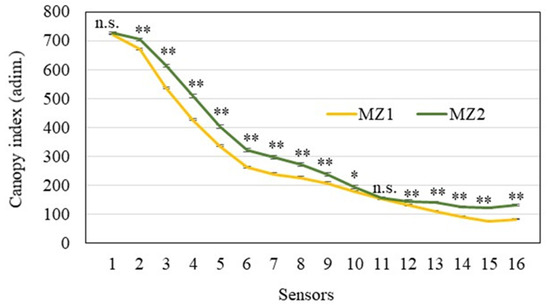 Canopy Index in 16 vertical sectors from the base (1) to the top (16) of hazelnut trees in the two management zones (MZs). Symbols for statistical significance (n.s., * and ** mean not significant and significant at p ≤ 0.05 and p ≤ 0.01, respectively) are displayed for each couple of sector data; vertical bars indicate SE (n = 474 and 378 in MZ1 and MZ2, respectively).