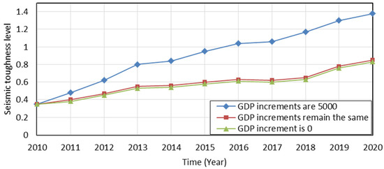 Based on Figure 3, it can be seen that when the GDP increment increased, the rate of improvement in urban seismic resilience also increased. The faster the socio-economic development, the faster the improvement in urban seismic resilience. This is consistent with the actual situation, indicating that the model’s simulation is effective and robust.