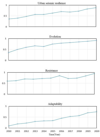 After verifying the model through the aforementioned validation methods, the constructed system dynamics model of Chengdu was found to be reliable. Through simulation using Vensim software, the results of the evaluation of the city’s seismic resistance, adaptability, and recovery capacity could be obtained, as shown in Figure 4. As seen from Figure 4, Chengdu’s resistance, adaptability, and recovery capacity all showed upward trends from 2010 to 2020. Furthermore, the growth rate of the recovery capacity and resistance were similar, while the adaptability increased at a faster rate than the other two.