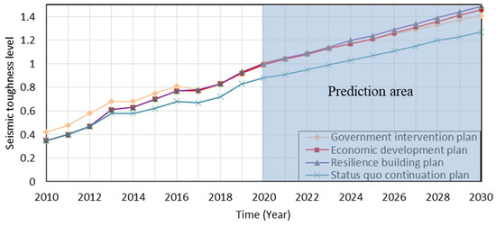 The government intervention plan had a city seismic resilience level of 1.01053 in 2020, higher than the other three plans, but in 2030, it ranked only third, with a level of 1.42339. This indicates that government intervention measures can effectively improve the city’s seismic resilience level, but there is insufficient follow-up, resulting in slower growth rates when other indicators remain unchanged.